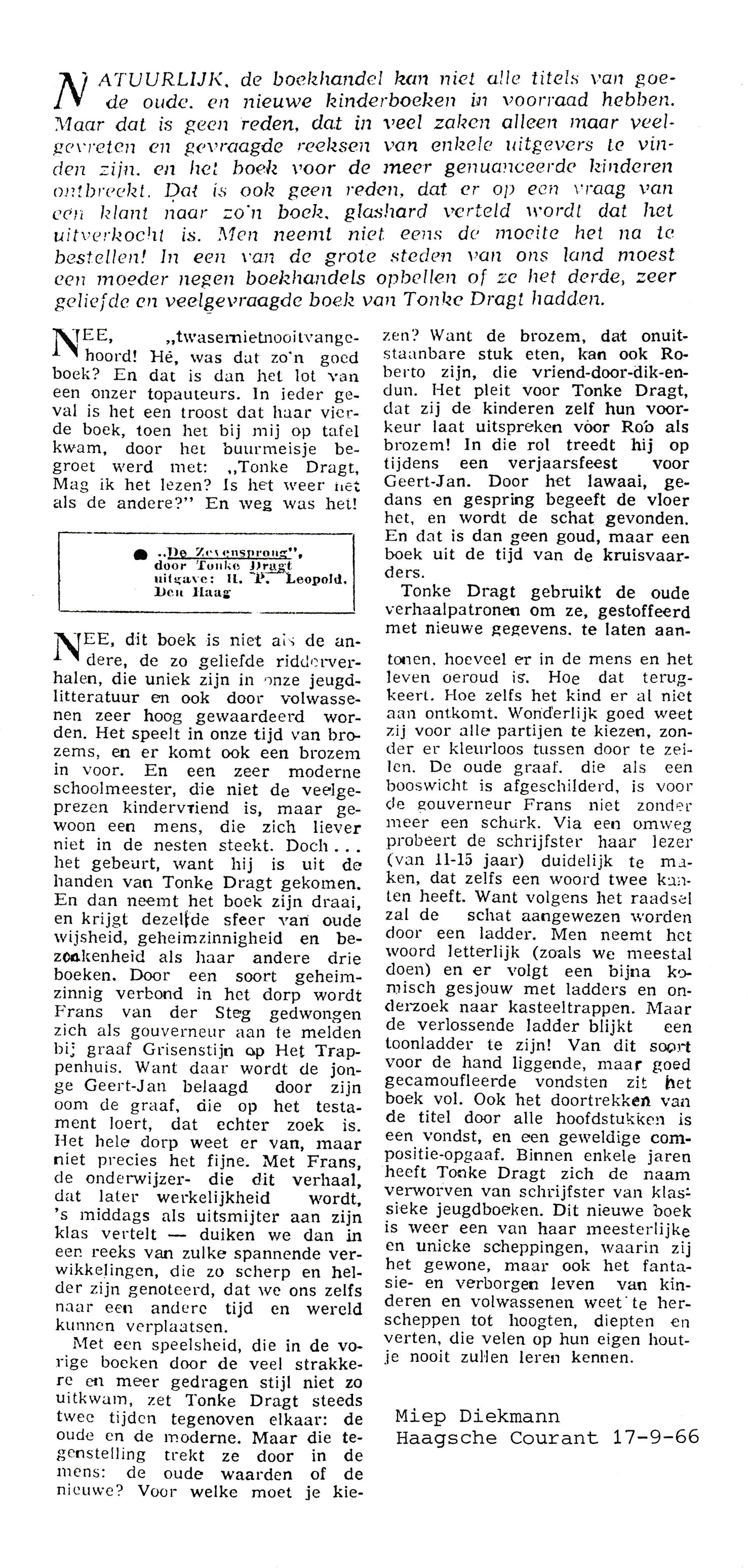 Deze uitgebreide recensie is geschreven door Miep Diekmann en verscheen op 17 september 1966 in de Haagsche Courant.