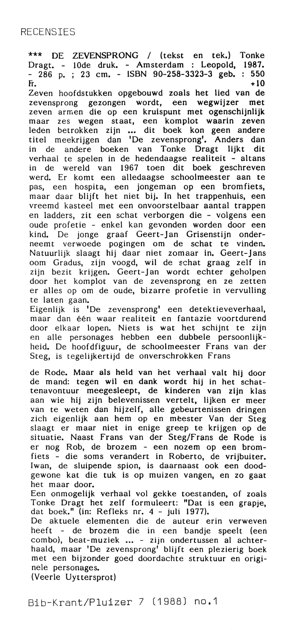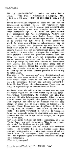 Deze recensie verscheen in januari 1988, vlak na het verschijnen van de 10de druk. Ze is geschreven door belgische Veerle Uyttersprot en verscheen in de Bib-Krant/Pluizer 7.